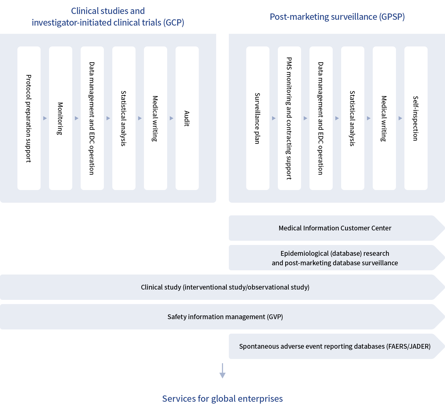 We support the entire sequence of your operations, including clinical trials, clinical studies, epidemiological research, post-marketing surveillance (PMS), and safety information management.