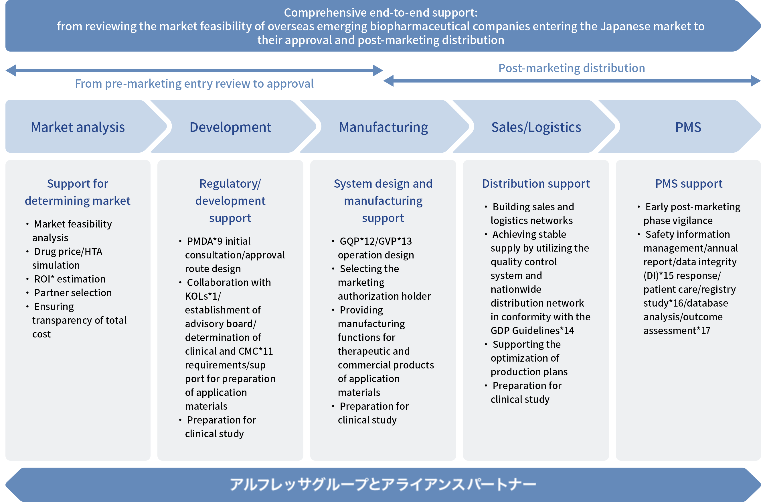 In collaboration with alliance partners of the Alfresa Group, we support the development of optimal strategies for pharmaceutical affairs and reimbursement in Japan and support discussions with Japanese regulatory authorities (PMDA* and MHLW*).