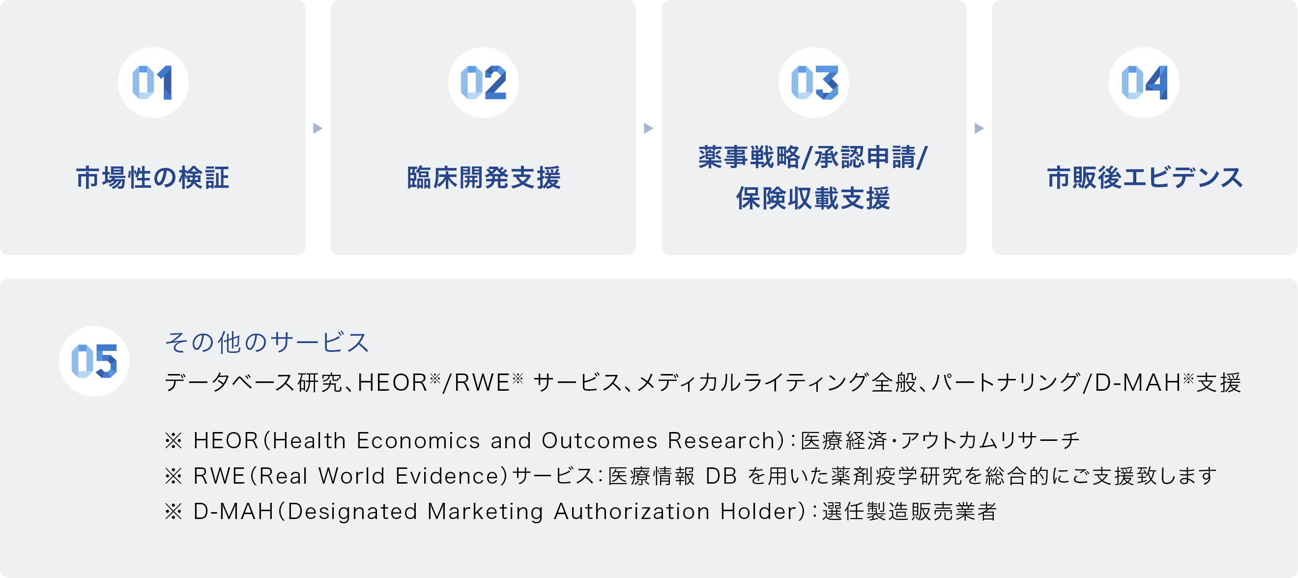 臨床試験は規制当局の承認取得に不可欠な場合が多い一方で、医療経済・アウトカム研究(HEOR)およびリアルワールドエビデンス(RWE)は、日本市場における製品価値をさらに確立するうえで重要な役割を果たします。当社のメンバーは、日本市場を想定したHEORおよびRWE研究の設計から実施までを担ってきた実績を有しています。