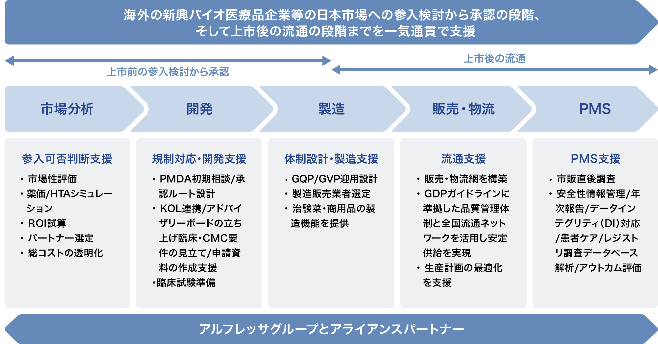 アルフレッサグループのアライアンスパートナー企業と連携し、日本における最適な薬事・保険償還戦略の策定を支援するとともに、日本国内の規制当局(PMDA※やMHLW※)との協議をサポートします。